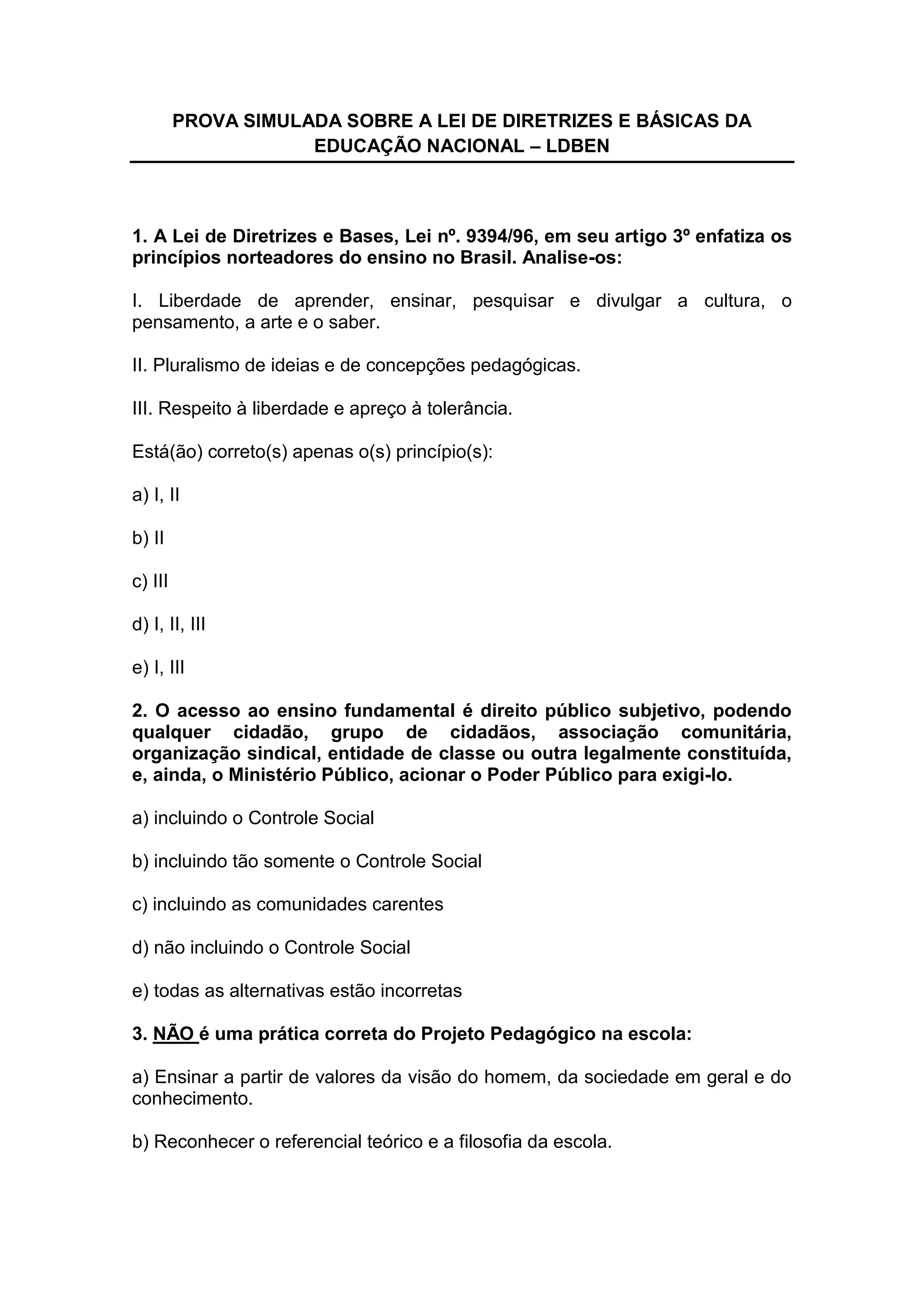 Este documento apresenta 25 questões sobre a Lei de Diretrizes e Bases da Educação Nacional (LDBEN). As questões abordam tópicos como princípios norteadores da educação brasileira, organização dos diferentes níveis e modalidades educacionais, carga horária, direitos da criança e do adolescente.