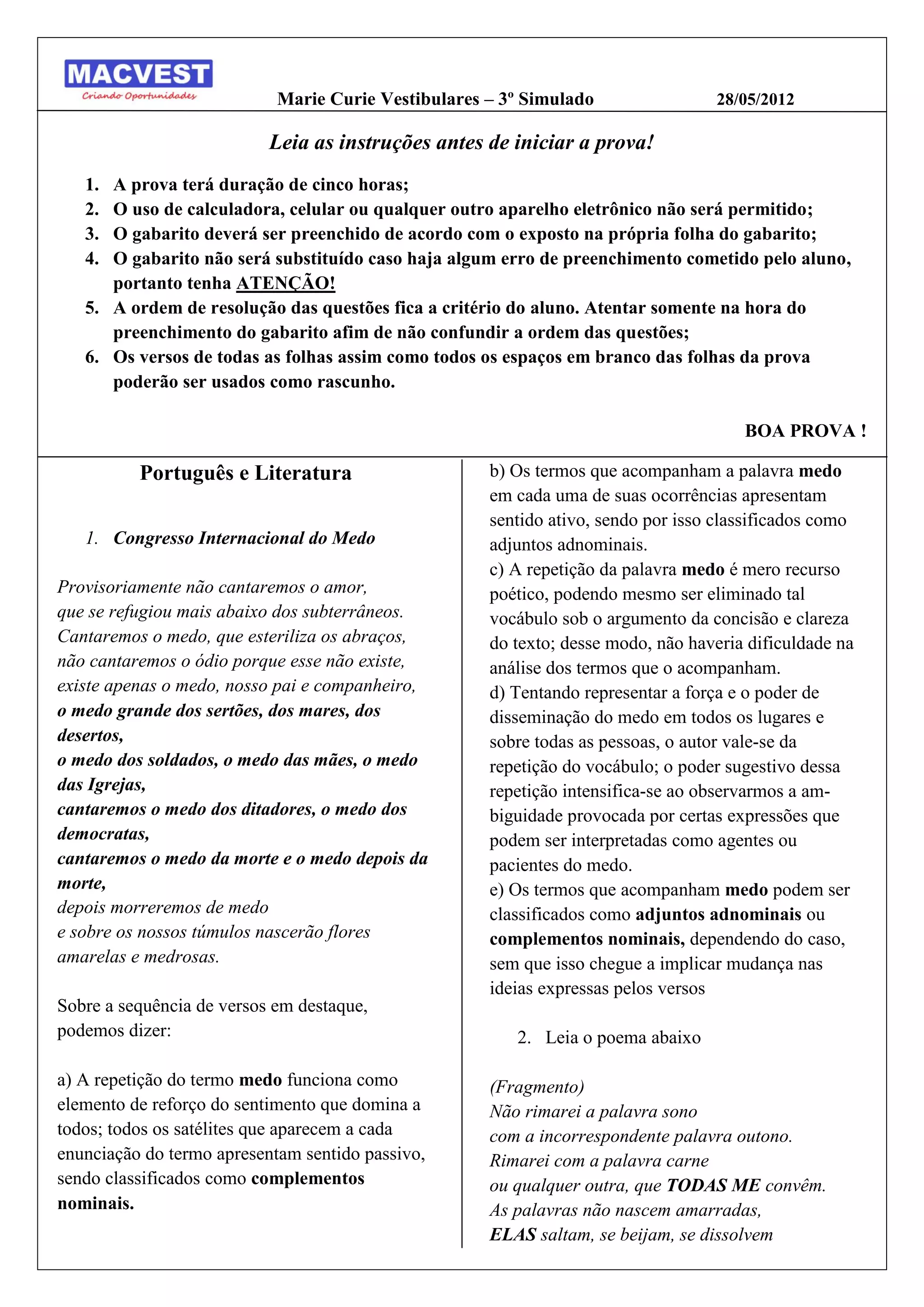 O documento fornece instruções sobre uma prova de vestibular que terá duração de cinco horas, sem o uso de calculadoras ou celulares. Os alunos devem preencher o gabarito de acordo com as instruções e podem usar os versos das folhas e espaços em branco para rascunhos.