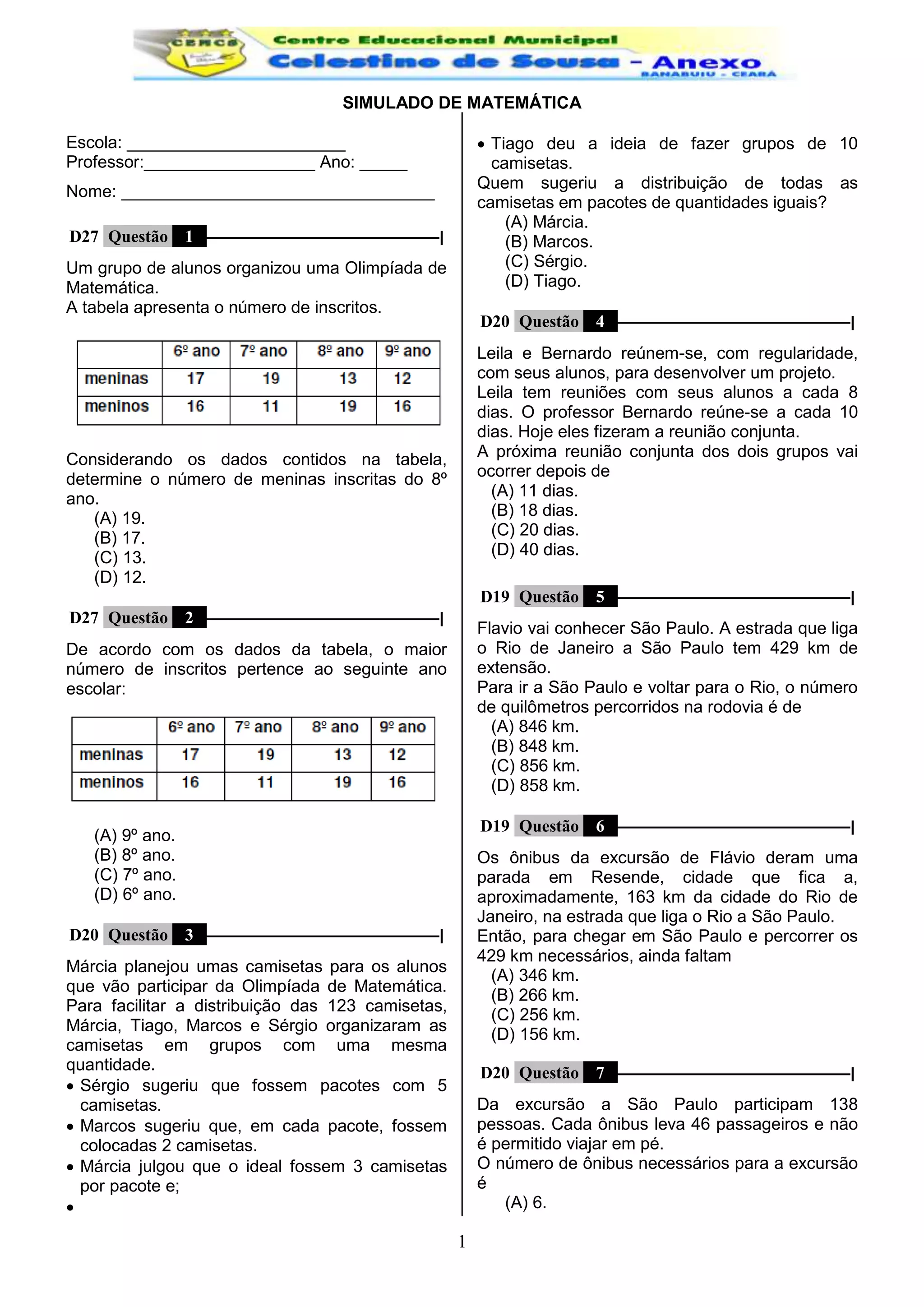 3. As questões subsequentes cobram conhecimentos de matemática como porcentagem, operações, geometria e interpretação de gráficos e tabelas.