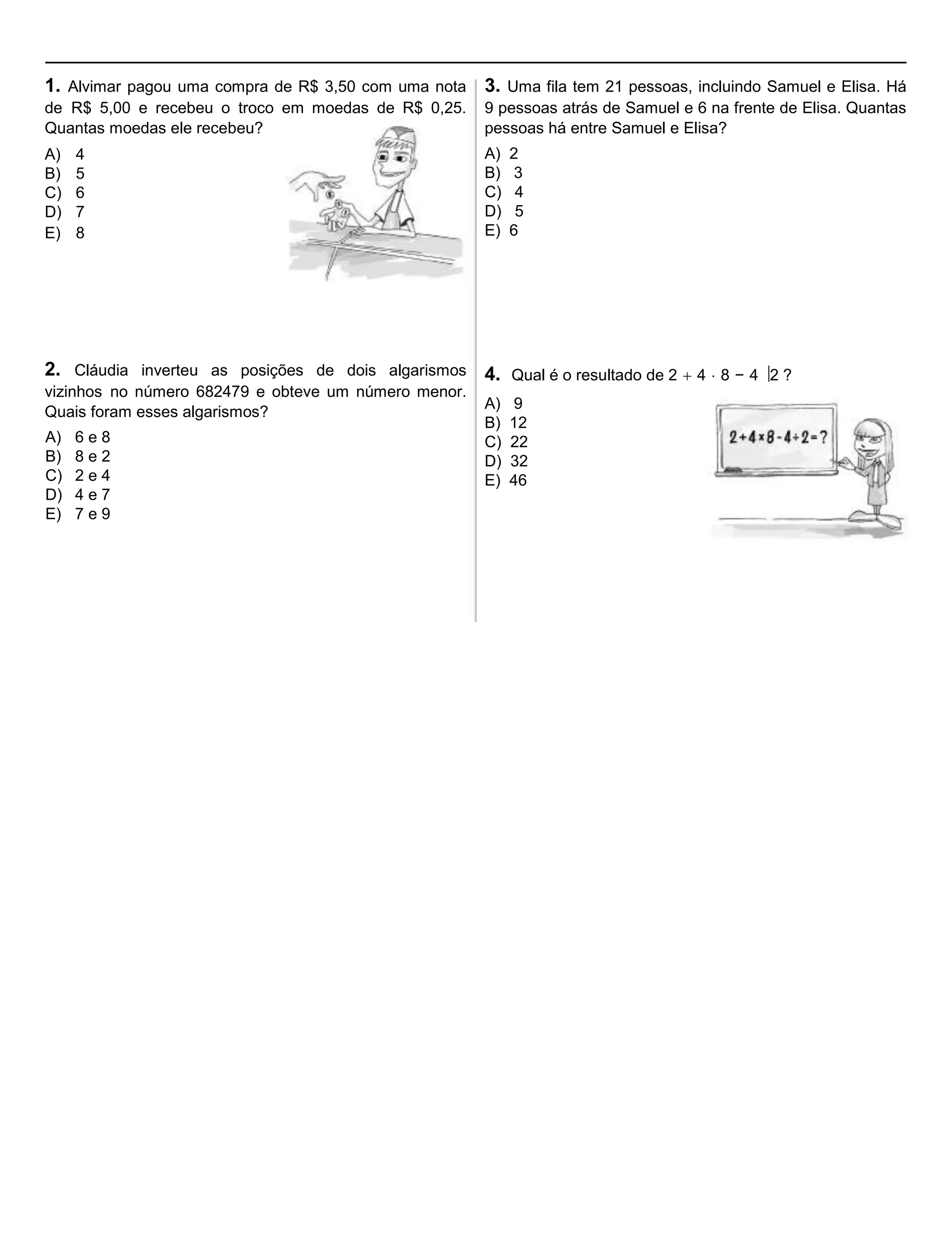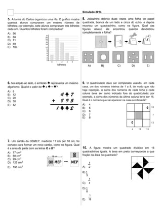 2. As perguntas abordam tópicos como cálculo de troco, inversão de algarismos em números, relação entre números em quadriculados e gráficos, áreas de figuras geométricas, sequências numéricas e lógica proposicional.