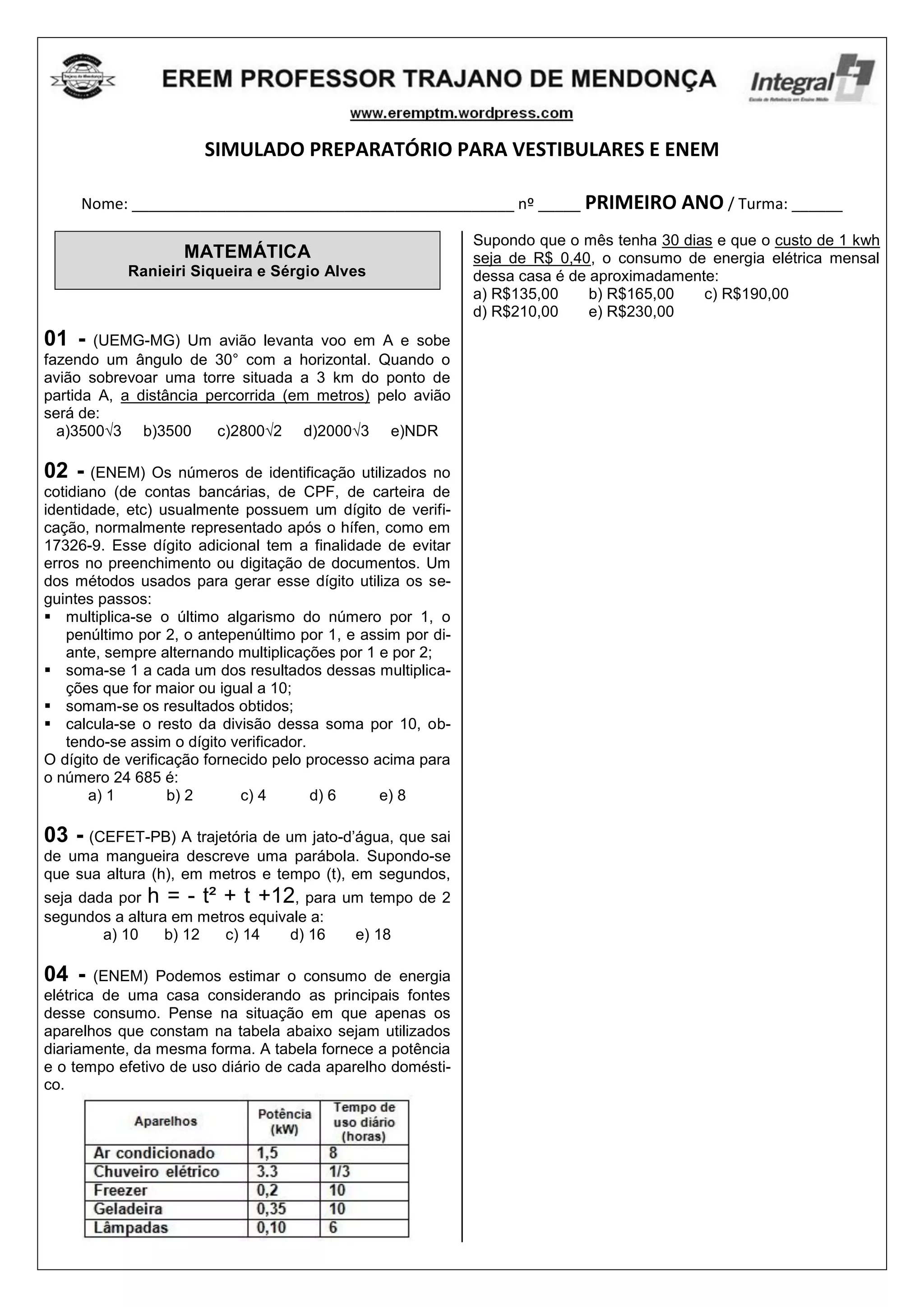 Este documento apresenta 15 questões de múltipla escolha sobre assuntos como matemática, química e física. As questões abordam tópicos como cálculos geométricos, propriedades atômicas, mudança de estado da matéria e fracionamento de petróleo. O documento tem como objetivo avaliar os conhecimentos dos estudantes em diferentes disciplinas para vestibulares e o ENEM.