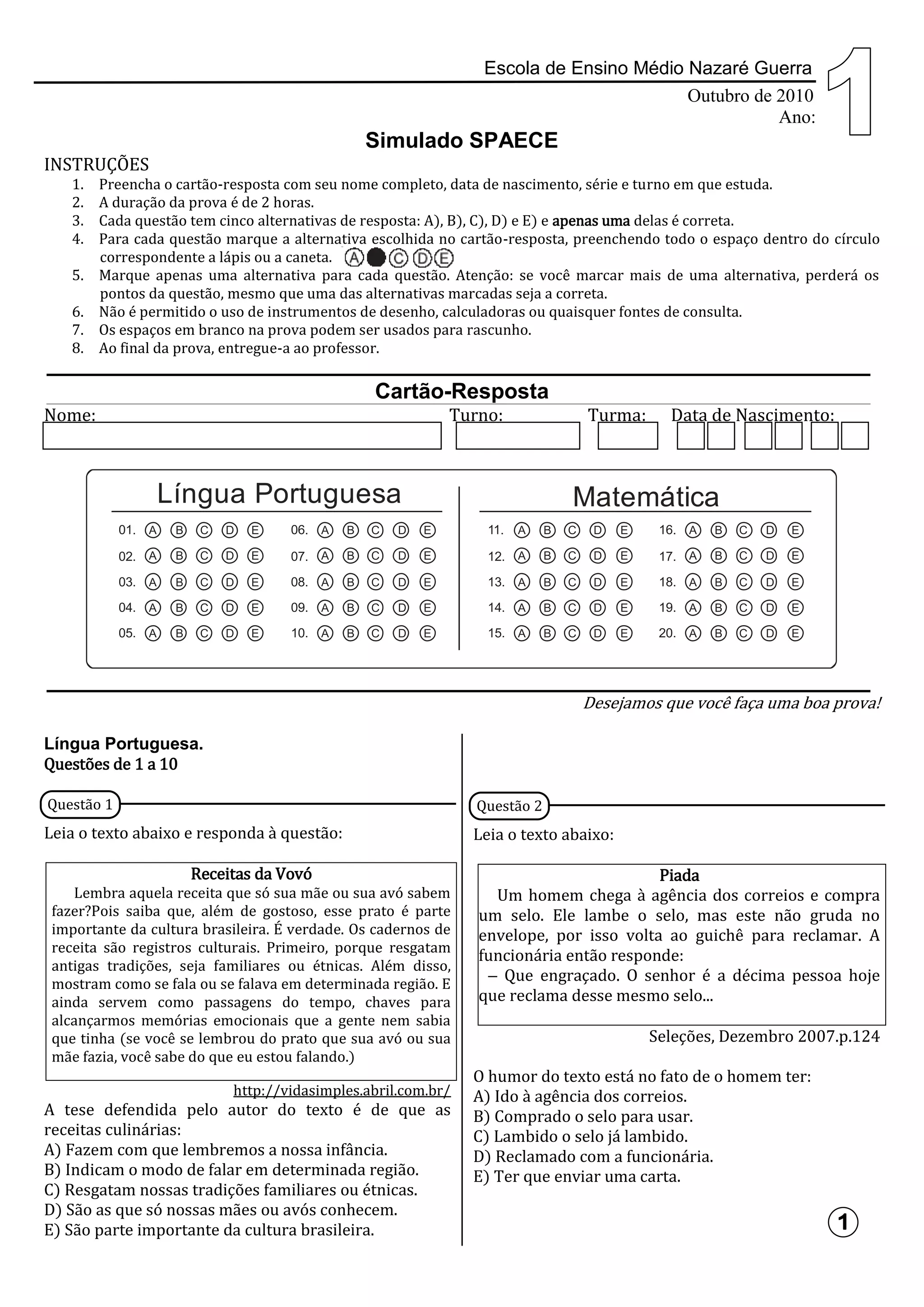 1) O documento fornece instruções sobre um simulado de português e matemática, incluindo como preencher o cartão de respostas e as regras da prova.
