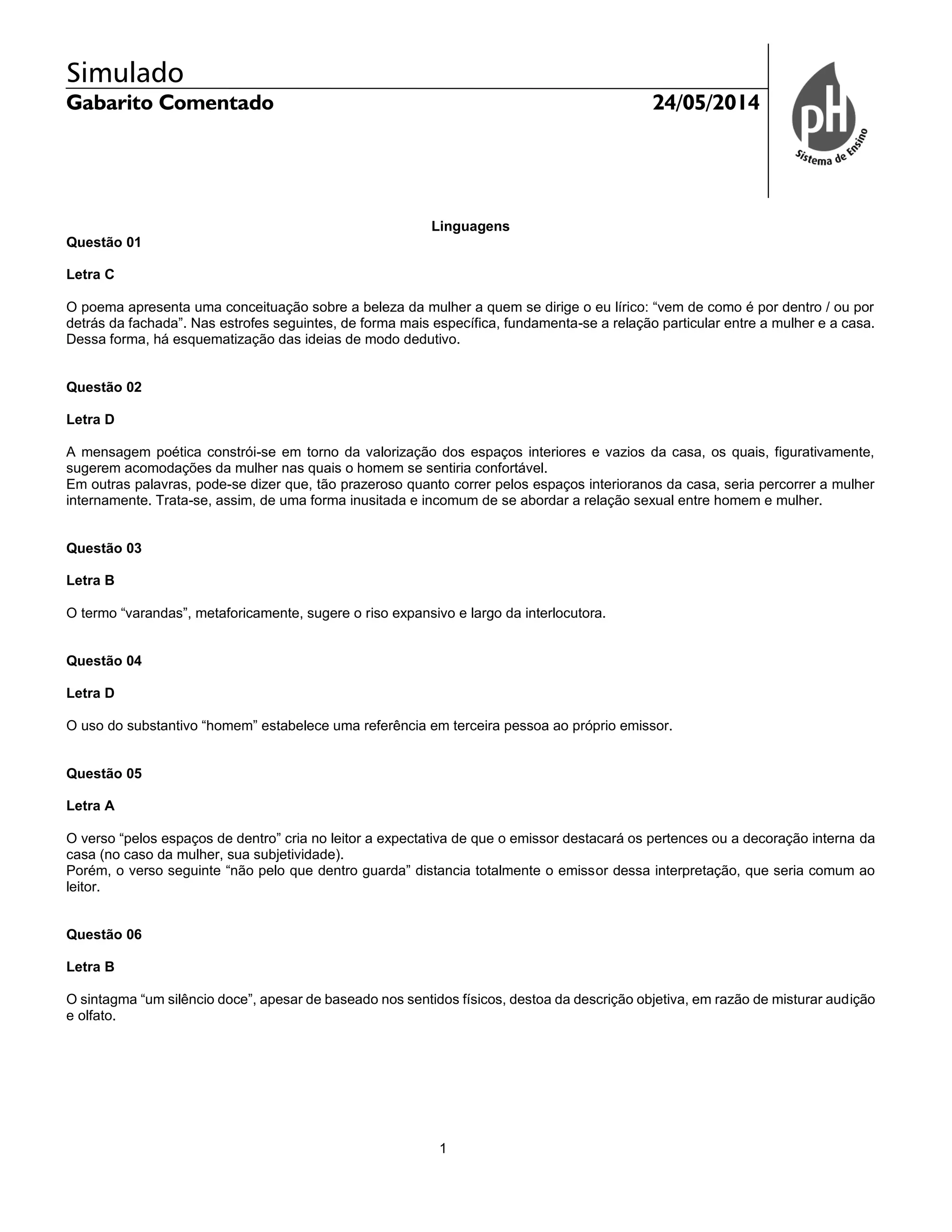 O documento apresenta as respostas e comentários de um gabarito de um simulado de línguas. O resumo aborda questões sobre poesia, relações entre homem e mulher e cristianismo. Há também questões sobre matemática financeira, probabilidade e geometria.