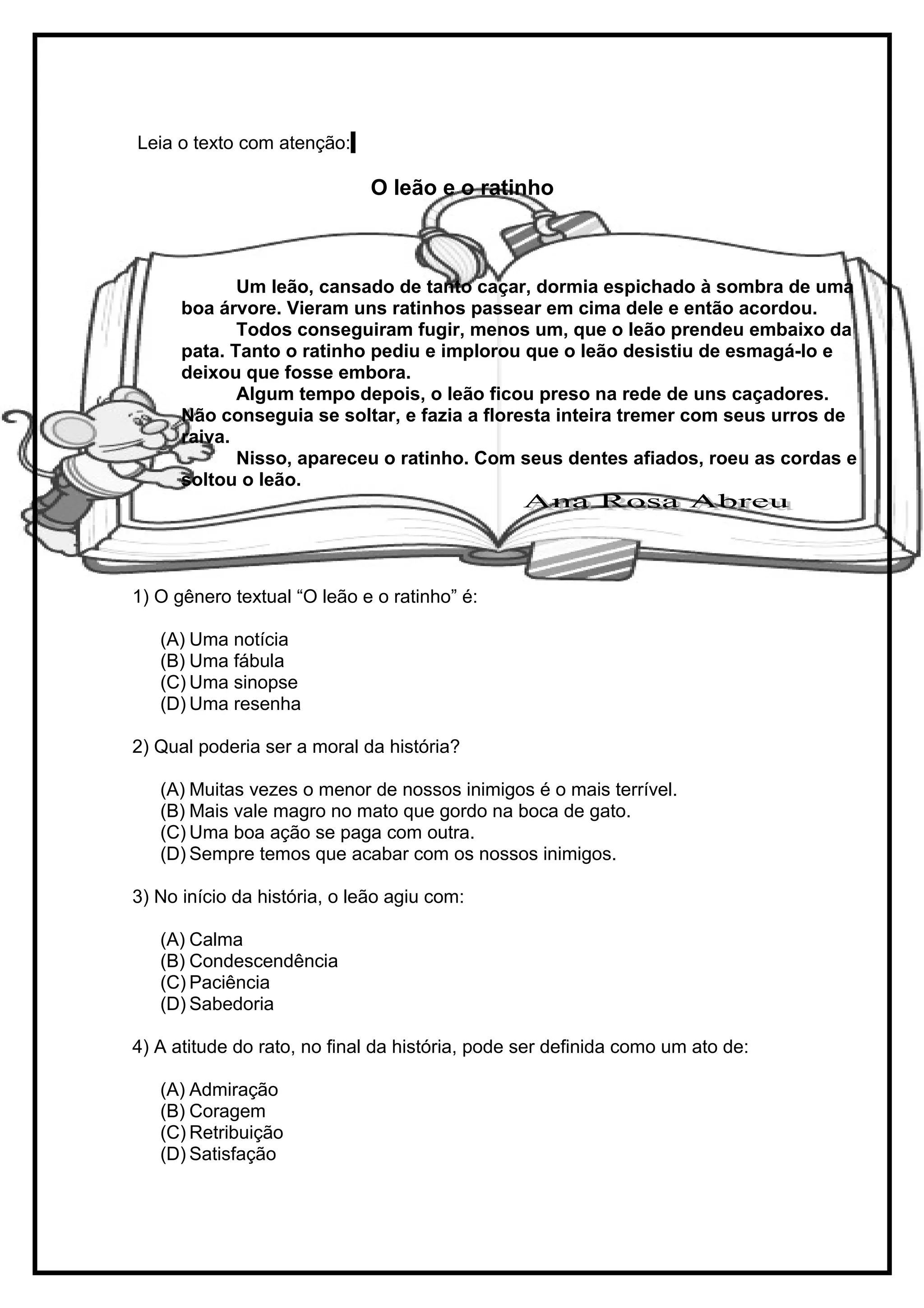 O documento apresenta uma fábula clássica chamada "O leão e o ratinho". Na história, um leão poupa a vida de um ratinho que depois retribui o favor salvando o leão de cair em uma armadilha de caçadores. A fábula sugere a moral de que pequenos atos de bondade podem ser retribuídos no futuro.