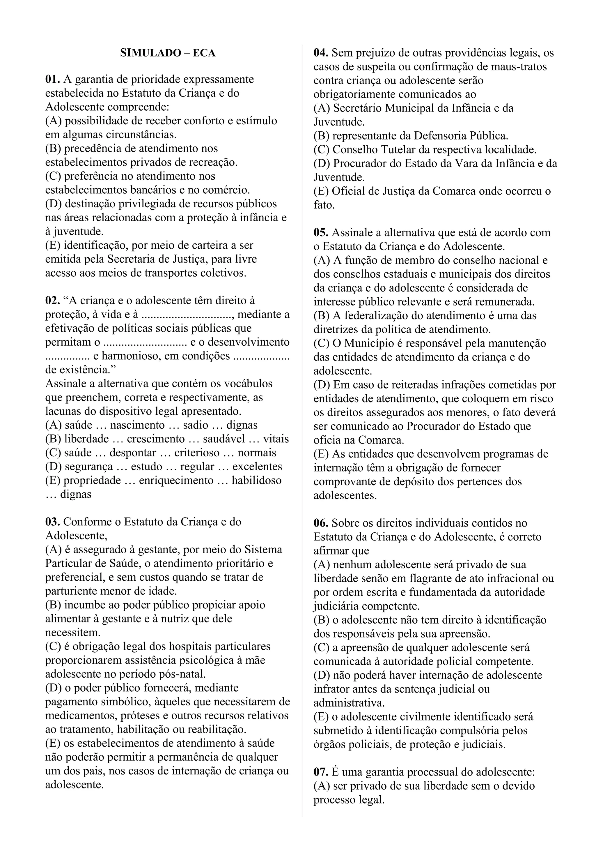 O documento apresenta 23 questões sobre os direitos da criança e do adolescente segundo o Estatuto da Criança e do Adolescente (ECA). As questões abordam tópicos como garantias de prioridade, direitos à saúde e proteção, medidas socioeducativas, atribuições do Conselho Tutelar e procedimentos de apuração de atos infracionais.