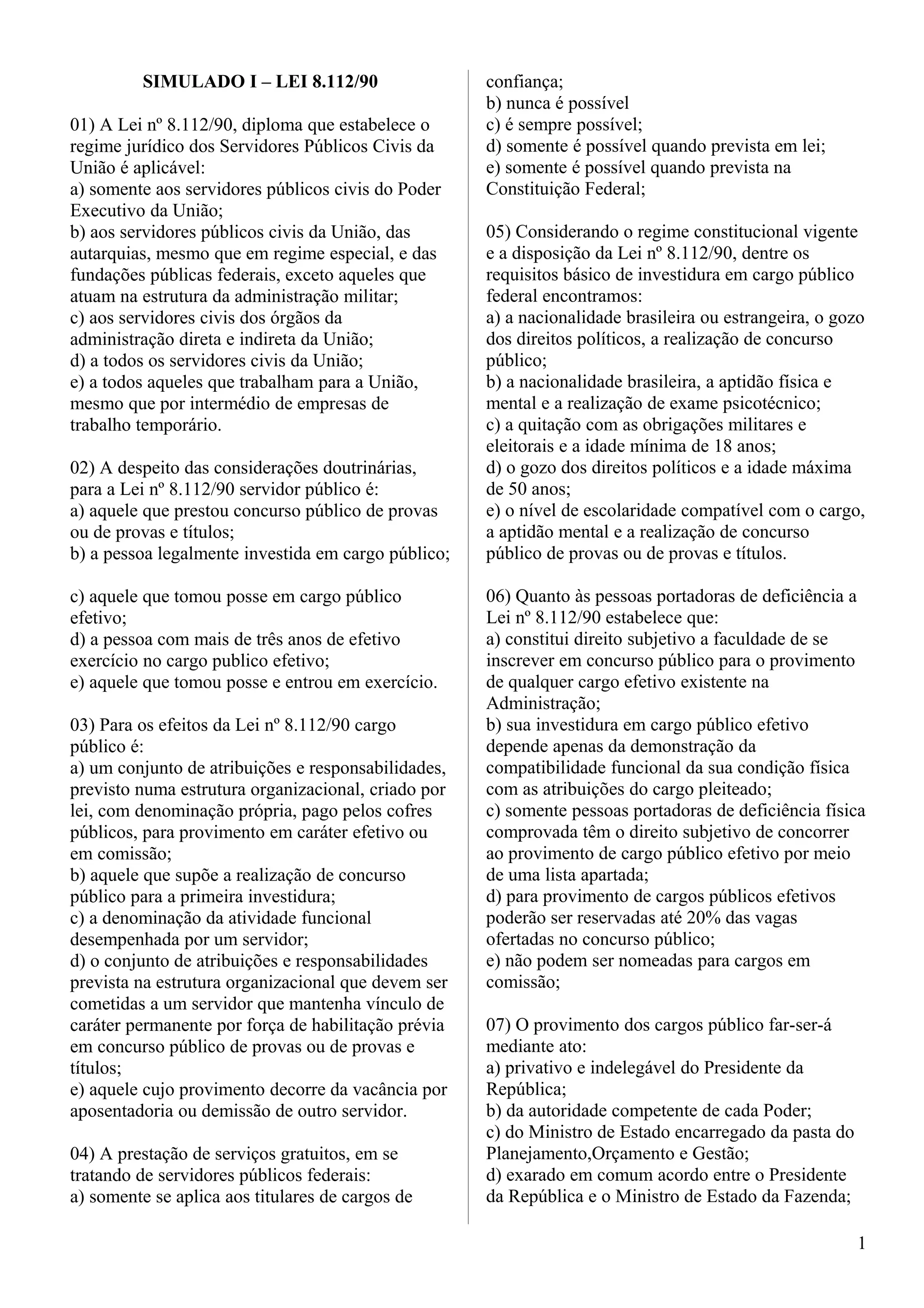 O documento discute a Lei no 8.112/90, que estabelece o regime jurídico dos servidores públicos civis da União. A lei se aplica a servidores públicos civis da União, autarquias e fundações públicas federais, exceto militares. Concurso público é requisito para investidura em cargo público efetivo. Posse e exercício são etapas distintas para ocupação regular de cargo público.