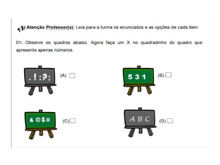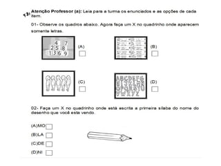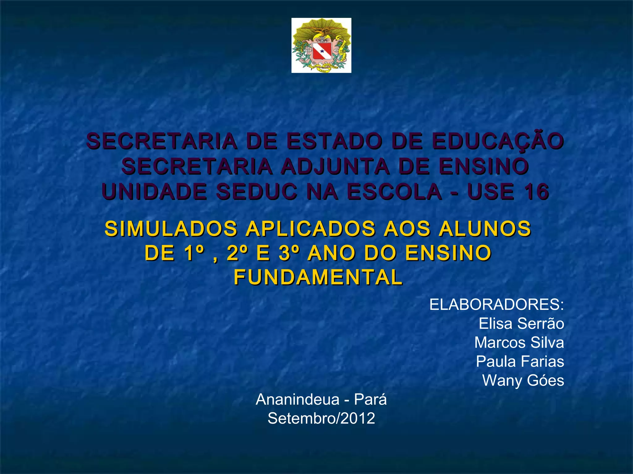 O documento discute os simulados aplicados aos alunos do 1o, 2o e 3o ano do ensino fundamental em Ananindeua - Pará em Setembro de 2012. Ele foi elaborado por quatro pessoas e detalha os testes aplicados para cada ano de escolaridade no período.