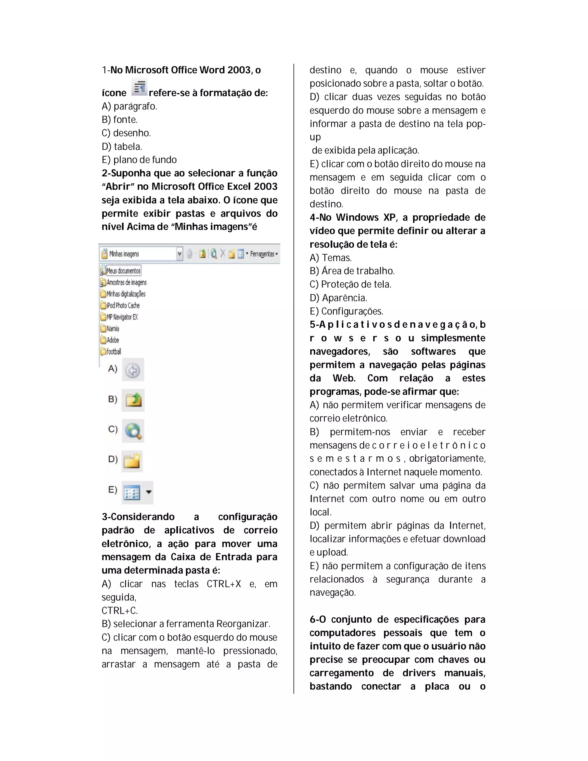 1. O documento fornece informações sobre comandos e ferramentas do Microsoft Office Word 2003 e Excel 2003, além de questões sobre segurança da informação e hardware.