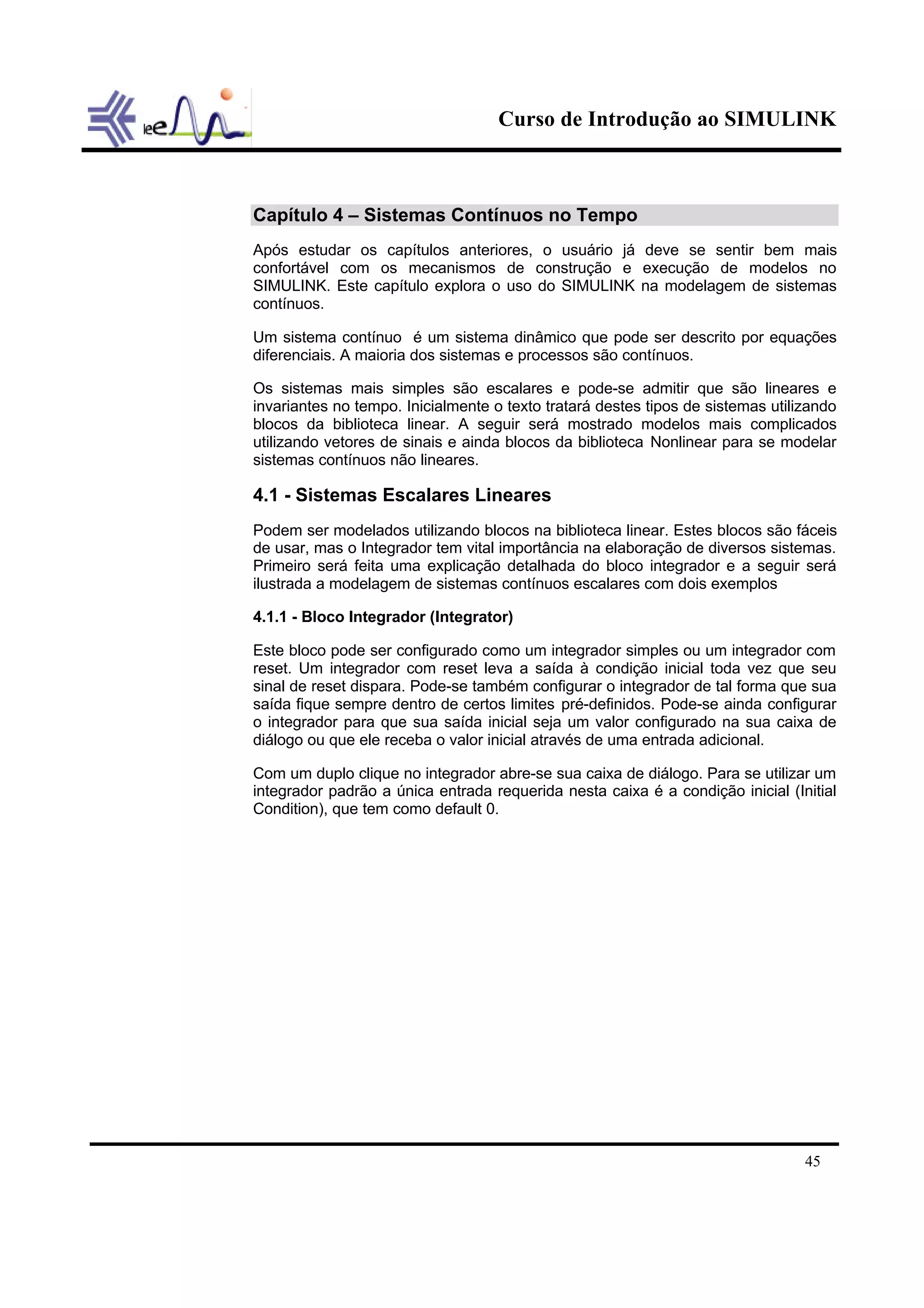 Este capítulo discute a modelagem de sistemas contínuos no tempo no Simulink. Apresenta o bloco integrador, fundamenta para modelar sistemas descritos por equações diferenciais, e exemplifica a modelagem de sistemas escalares lineares e o uso de funções de transferência.