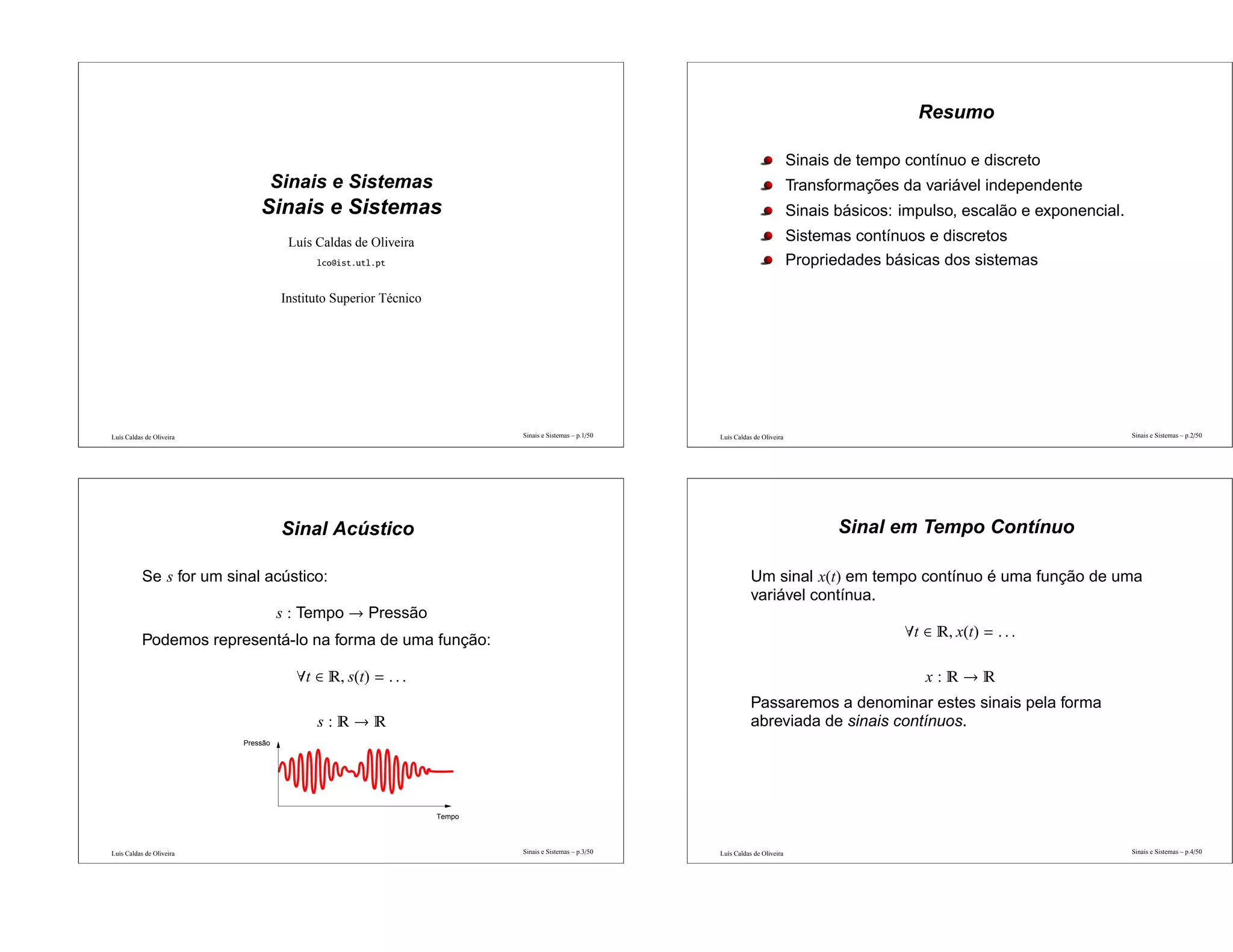 Este documento apresenta conceitos fundamentais sobre sinais e sistemas. Discute sinais em tempo contínuo e discreto, transformações de sinais, propriedades como energia e potência. Também aborda sistemas contínuos e discretos e como estes mapeiam sinais de entrada em saída.