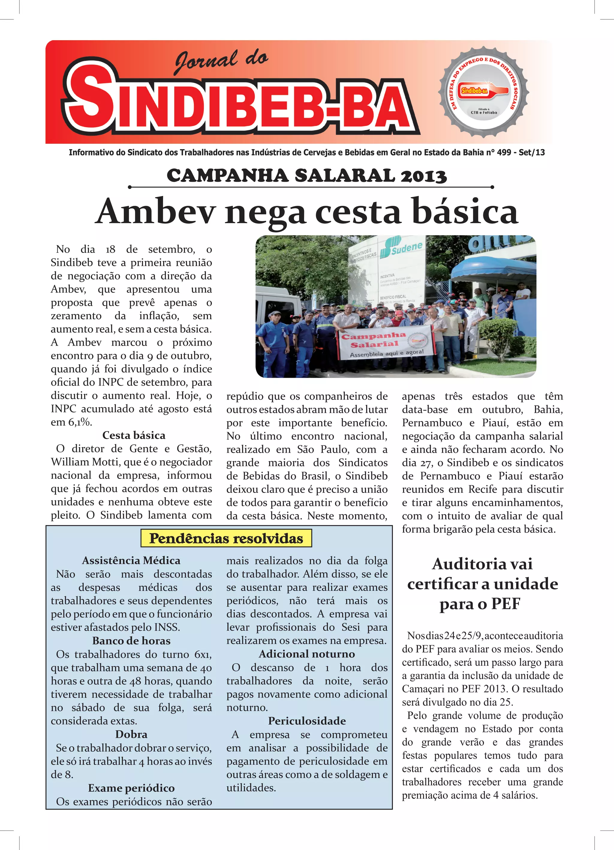 O documento relata as negociações salariais entre o Sindibeb (Sindicato dos Trabalhadores nas Indústrias de Cervejas e Bebidas) e empresas do setor na Bahia. A Ambev recusou aumento real e cesta básica. Outras empresas como a Heineken e a Indaiá também estão em negociação. O Sindibeb defende a unidade dos trabalhadores para garantir melhorias nas campanhas salariais.
