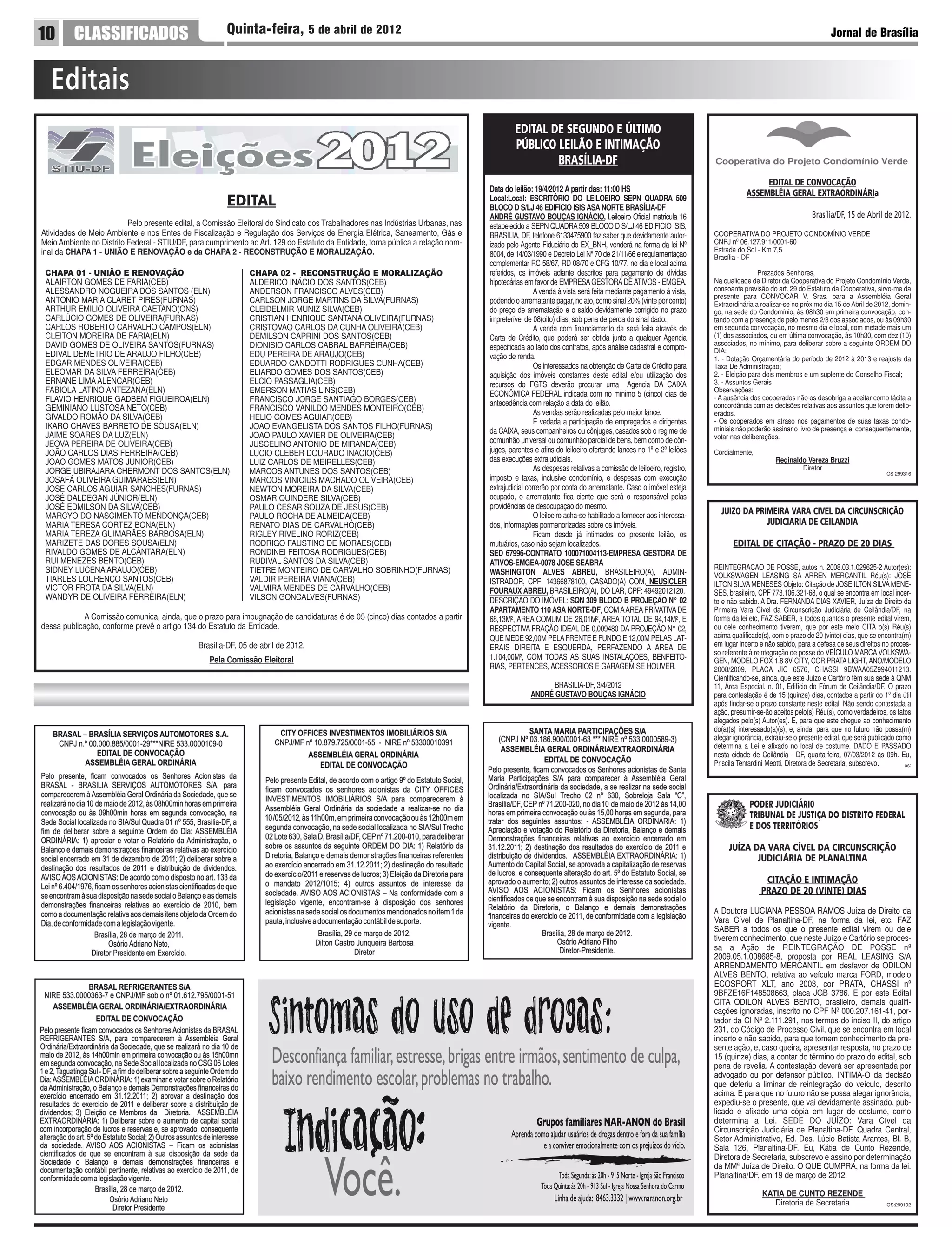 O documento contém vários editais de leilão, convocação de assembleia geral extraordinária, citação judicial e intimação. Os editais anunciam datas, locais e objetos de leilões, convocam associados para deliberar sobre orçamento, eleição e assuntos gerais de uma cooperativa, e citam e intimam réus sobre processos judiciais de reintegração de posse e outros assuntos.
