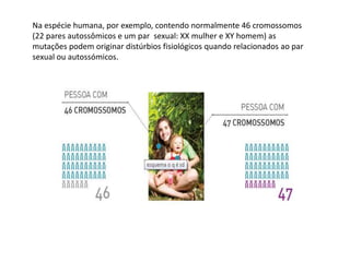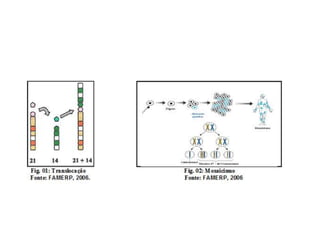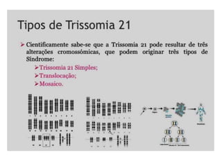A Síndrome de Down é causada pela presença de um cromossomo 21 extra e ocorre em 95% dos casos por trissomia desse cromossomo. Pode ser parcial ou em mosaico em pequenos percentuais de casos. Suas características incluem traços faciais distintos e atraso no desenvolvimento. A intervenção precoce é essencial para estimular a autonomia e habilidades da criança.