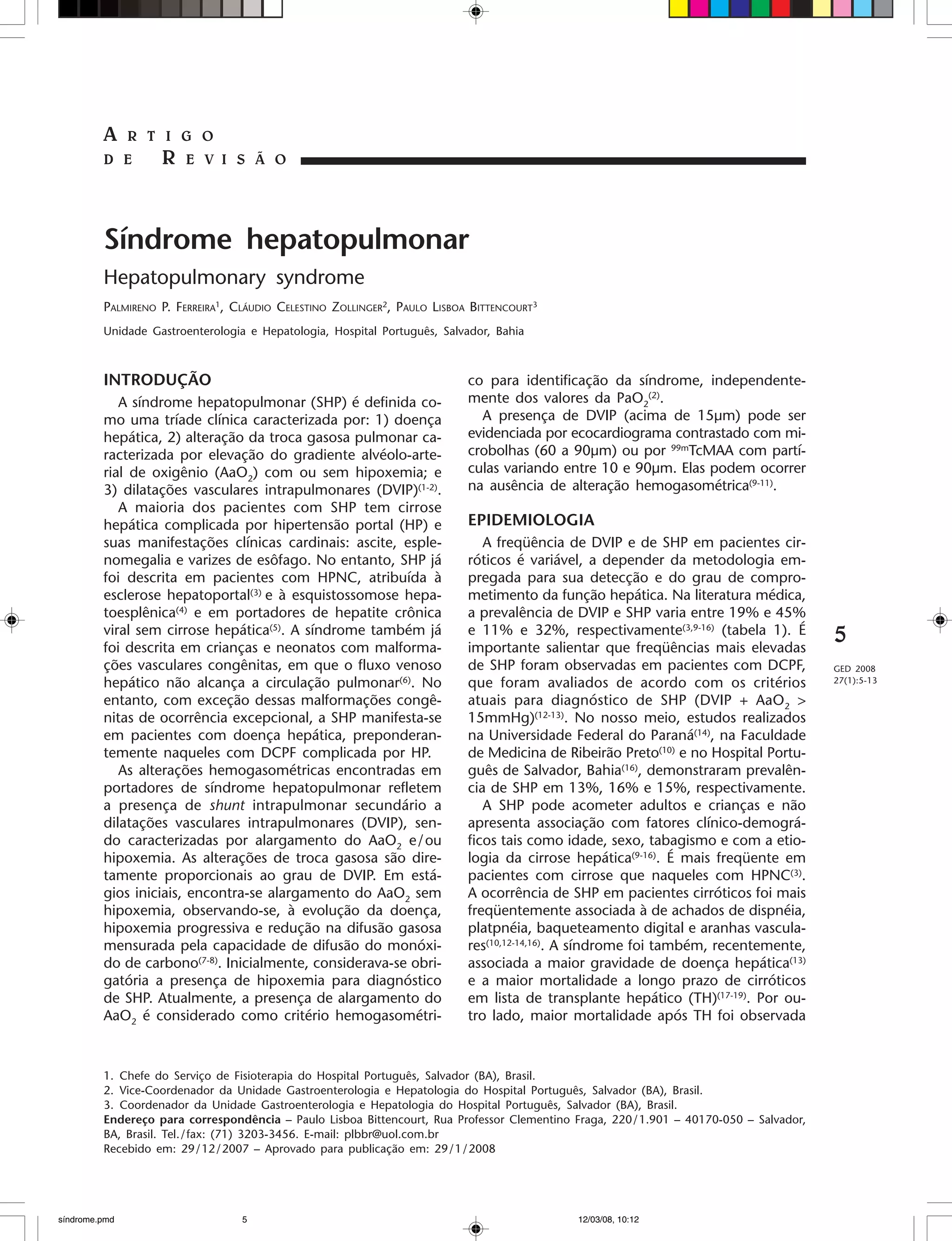 1) O documento descreve a síndrome hepatopulmonar, definida como alterações na troca gasosa pulmonar associadas a dilatações vasculares intrapulmonares em pacientes com doença hepática.