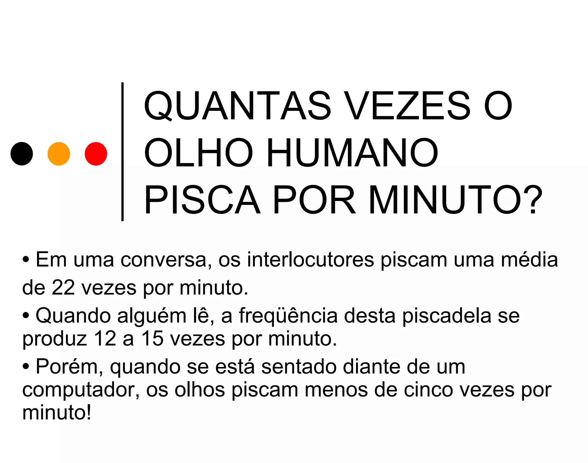 O documento discute quantas vezes o olho humano piscam por minuto em diferentes situações e os riscos de olho seco e cansaço ocular ao usar computadores por longos períodos. Quando lendo ou conversando, os olhos piscam de 12 a 22 vezes por minuto, mas quando usando computadores a taxa cai para menos de 5 vezes por minuto, aumentando o risco de olho seco. A posição do monitor também é importante, devendo ficar abaixo da linha dos olhos para melhor lubrificação.