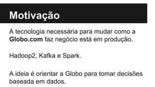 O documento propõe a criação de um ambiente interativo para análise de big data na Globo.com utilizando Spark e IPython. O sistema permitiria acessar todos os dados da empresa, rodar algoritmos de machine learning para identificar informações relevantes, formular hipóteses e experimentos para tomada de decisões baseadas em dados.