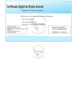 O documento registra a obra intitulada 'Planeta dos Cães' do autor Marco Aurélio Santos, que narra a transformação de cães em seres inteligentes após uma experiência com DNA humano, resultando em uma revolta contra os humanos. A história se passa em um mundo em que os cães dominam a sociedade e os humanos são subjugados. O enredo explora temas de poder, rebelião e a ironia da criação humana que levou à revolução canina.