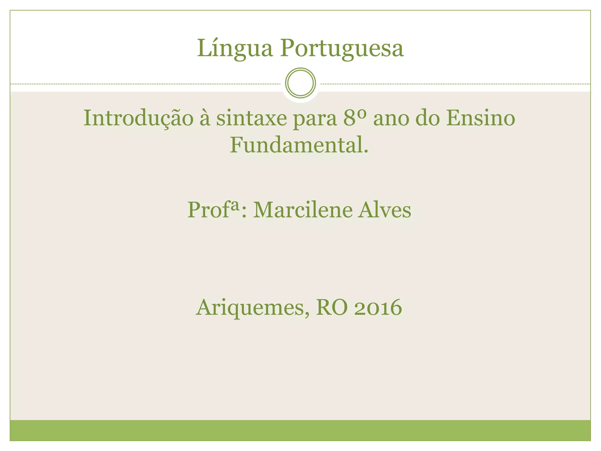 Este documento introduz conceitos básicos de sintaxe para alunos do 8o ano, definindo frase, oração e período. Explica que sintaxe estuda a função das palavras na frase e da frase no discurso. Uma frase pode ser nominal ou verbal, sendo que apenas a verbal pode ser considerada oração. Por fim, define período como frase constituída por uma ou mais orações, podendo ser simples ou composto.