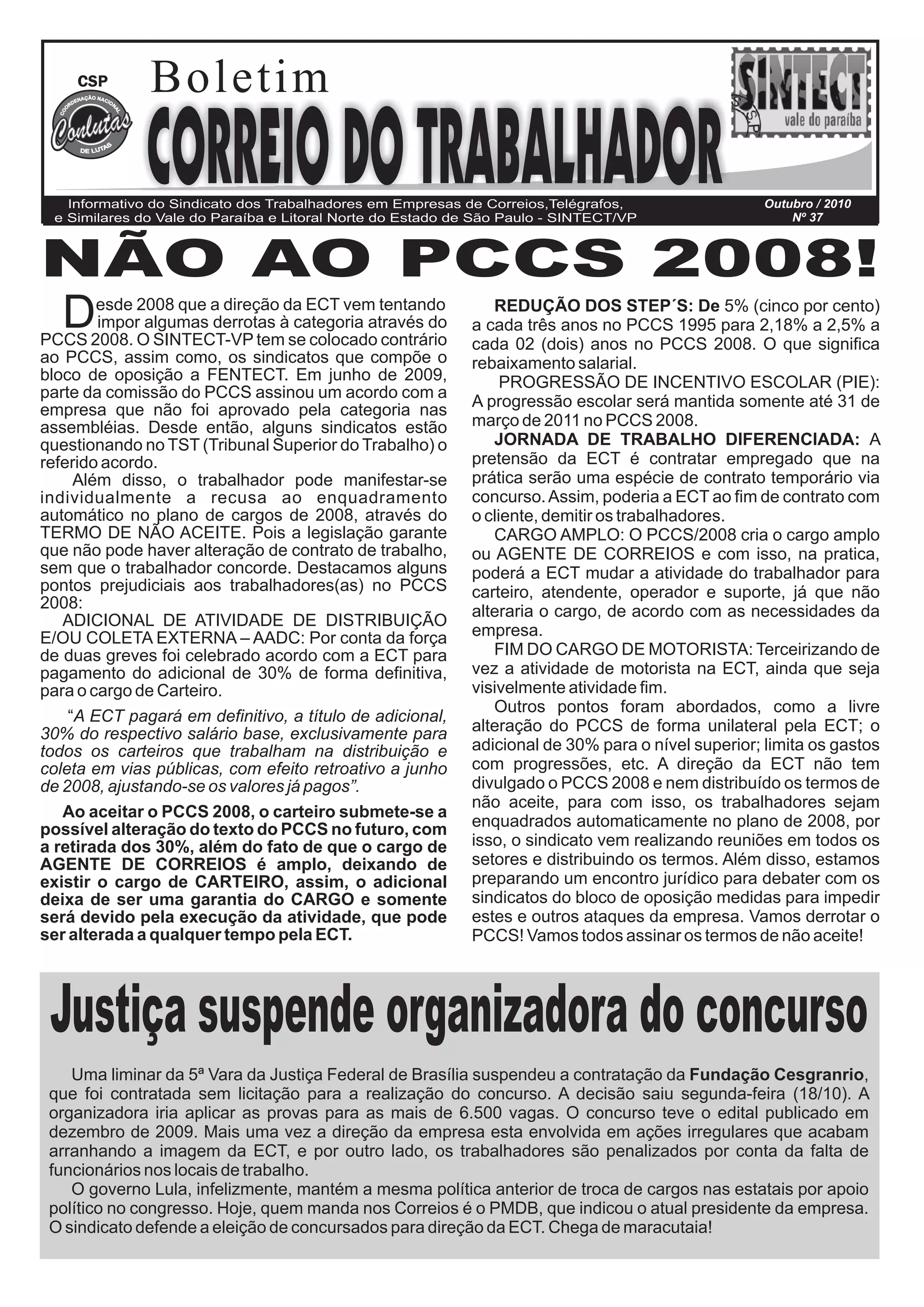 O documento discute o Plano de Cargos e Salários (PCCS) 2008 da Empresa Brasileira de Correios e Telégrafos (ECT) e seus pontos prejudiciais aos trabalhadores, como a redução dos step's, fim do cargo de motorista e criação de cargos amplos. Também menciona a suspensão de concurso pela ECT e a continuidade da greve na França contra a reforma da previdência.