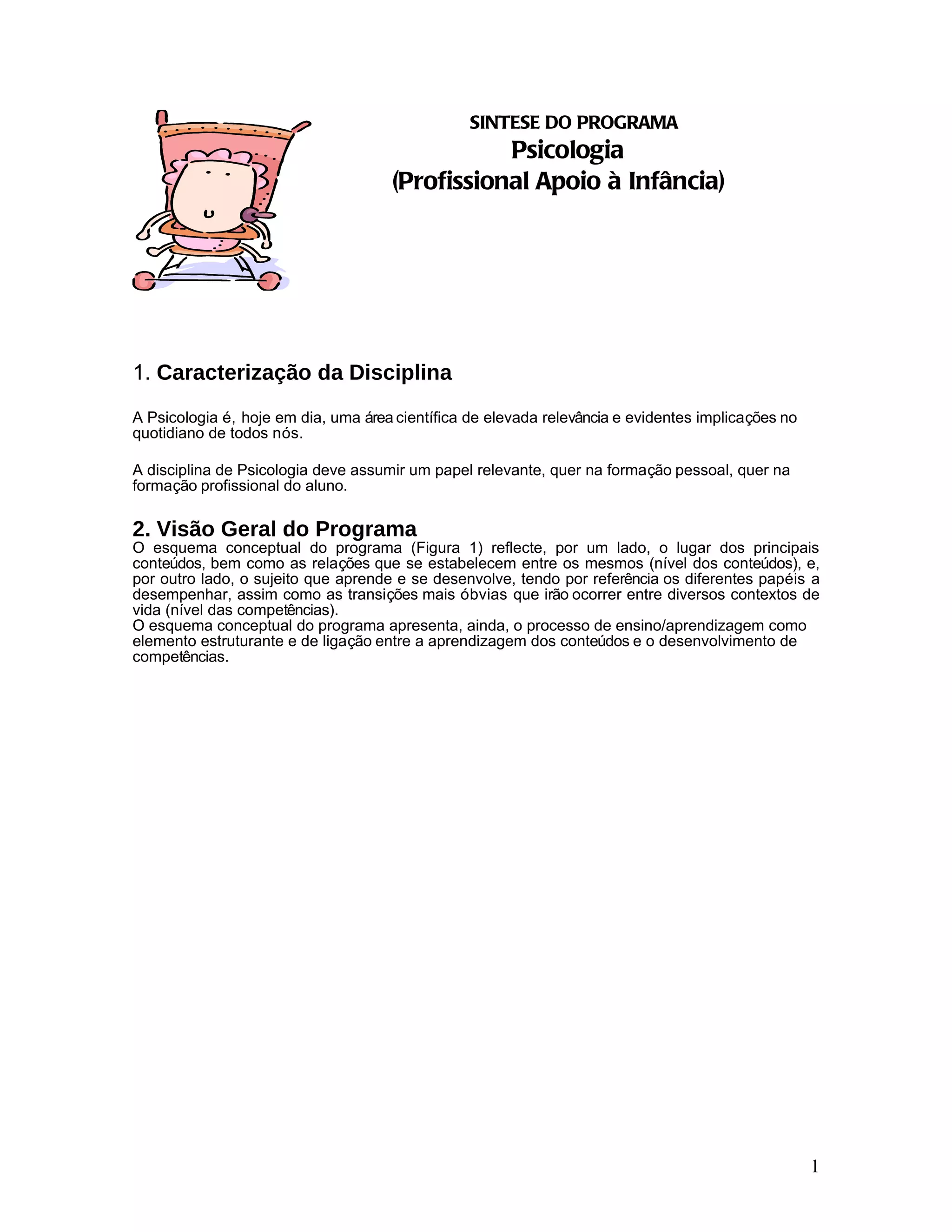 Este documento fornece um resumo do programa de Psicologia para profissionais de apoio à infância. O programa é composto por sete módulos que abordam tópicos como o desenvolvimento humano, processos cognitivos, emocionais e motivacionais, processos relacionais e comportamento profissional, aprendizagem, diversidade e intervenção. O objetivo é fornecer conhecimentos sobre psicologia para apoiar crianças e futuros profissionais.