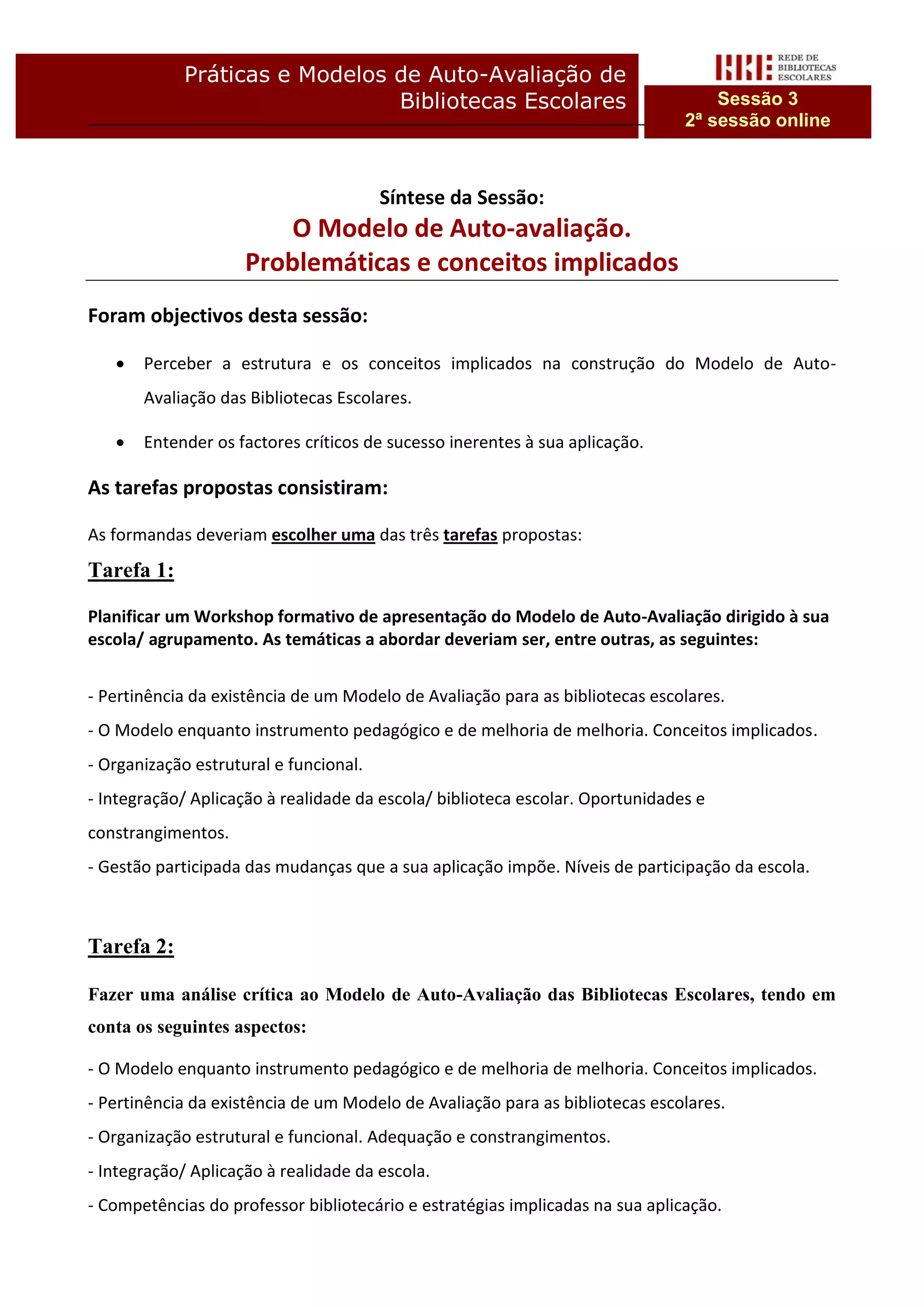 Este documento resume a segunda sessão online sobre práticas e modelos de auto-avaliação de bibliotecas escolares. As formandas tiveram três tarefas para escolher: planificar um workshop sobre o modelo de auto-avaliação, fazer uma análise crítica do modelo, ou escrever sobre os aspectos essenciais da mudança que a implementação do modelo trará. A maioria das formandas completou as tarefas dentro do prazo, embora algumas não tenham cumprido.