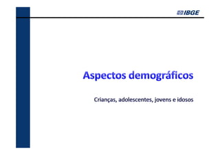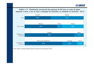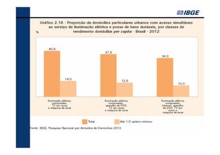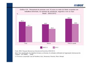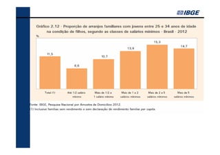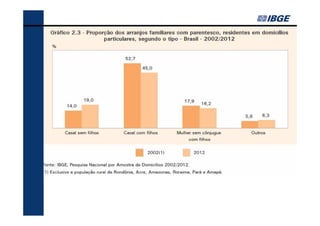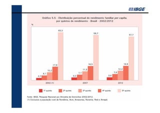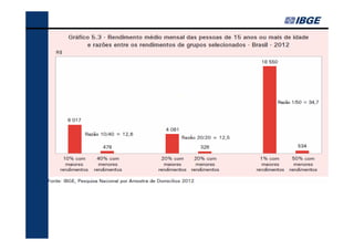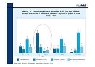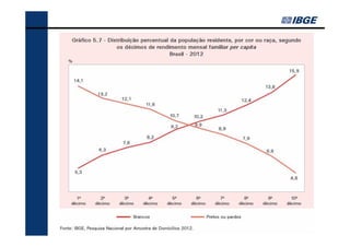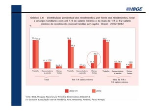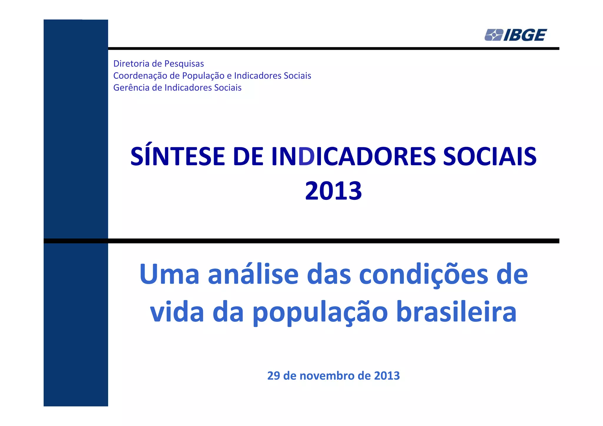 O documento fornece um resumo dos principais indicadores sociais do Brasil em 2013, cobrindo tópicos como demografia, desigualdades, educação, trabalho, renda e saúde. Analisa as mudanças ocorridas entre 2002-2012 e contextualiza os desafios atuais, como a redução das desigualdades e o envelhecimento populacional.