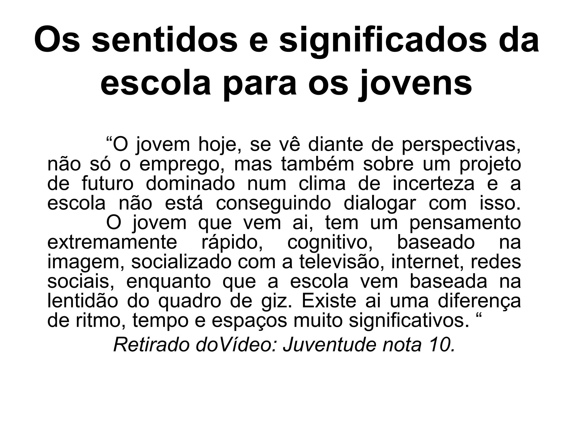 O documento discute os sentidos e significados da escola para os jovens hoje em dia. Afirma que a escola precisa dialogar melhor com as perspectivas e estilos de pensamento dos jovens, que são diferentes do formato tradicional da escola. Também destaca a importância de compreender como os jovens aprendem na escola e de estabelecer um diálogo entre os conteúdos e a realidade dos estudantes.