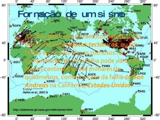 Um sismo ocorre quando há liberação repentina de energia sob a forma de ondas sísmicas, geralmente nas fronteiras de placas tectônicas. Podem ser classificados como superficiais, intermediários ou profundos dependendo da profundidade. Maremotos são sismos oceânicos que podem gerar tsunamis, ondas gigantescas que atingem costas.