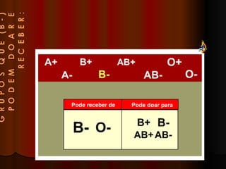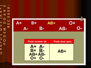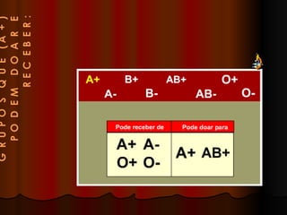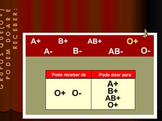 O documento resume os principais conceitos sobre os grupos sanguíneos ABO e fator Rh, como foram descobertos no início do século XX e como afetam a compatibilidade na transfusão de sangue. Explica que os tipos sanguíneos O e A são os mais comuns no Brasil, representando 87% da população, e discute os procedimentos e precauções necessários para doação e recebimento de sangue.