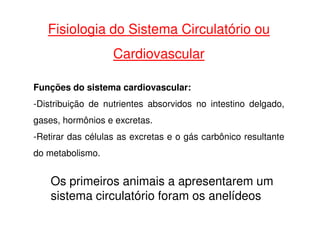 O documento descreve o sistema cardiovascular e sua fisiologia. O sistema transporta nutrientes, gases e excretas através dos vasos sanguíneos. Descreve os principais componentes como sangue, vasos e coração, além das circulações pulmonar e sistêmica. Explica também as diferenças na circulação entre peixes, anfíbios, répteis, aves e mamíferos.