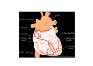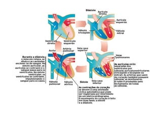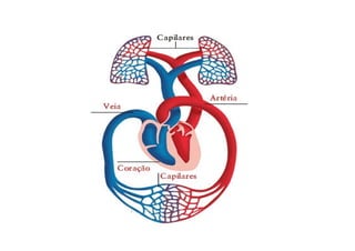 O documento descreve o sistema cardiovascular, incluindo seu papel no transporte de gases, nutrientes, resíduos e hormônios pelo corpo. Ele explica que o sistema é composto pelo coração e vasos sanguíneos, com o coração bombeando o sangue através de dois circuitos - a circulação pulmonar e a circulação sistêmica. O documento também discute a atividade elétrica do coração e fatores que afetam a frequência cardíaca.