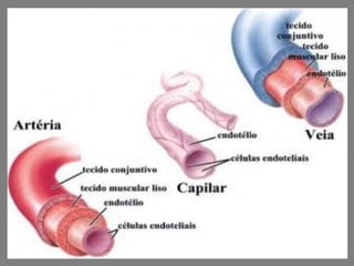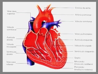O documento descreve o sistema cardiovascular, incluindo o coração, vasos sanguíneos e sangue. O coração é um órgão muscular oco que bombeia sangue pelo corpo através da contração e relaxamento. Há três principais tipos de vasos sanguíneos - artérias, veias e capilares. O sangue transporta nutrientes, gases e resíduos, e contém plasma, glóbulos vermelhos, brancos e plaquetas.