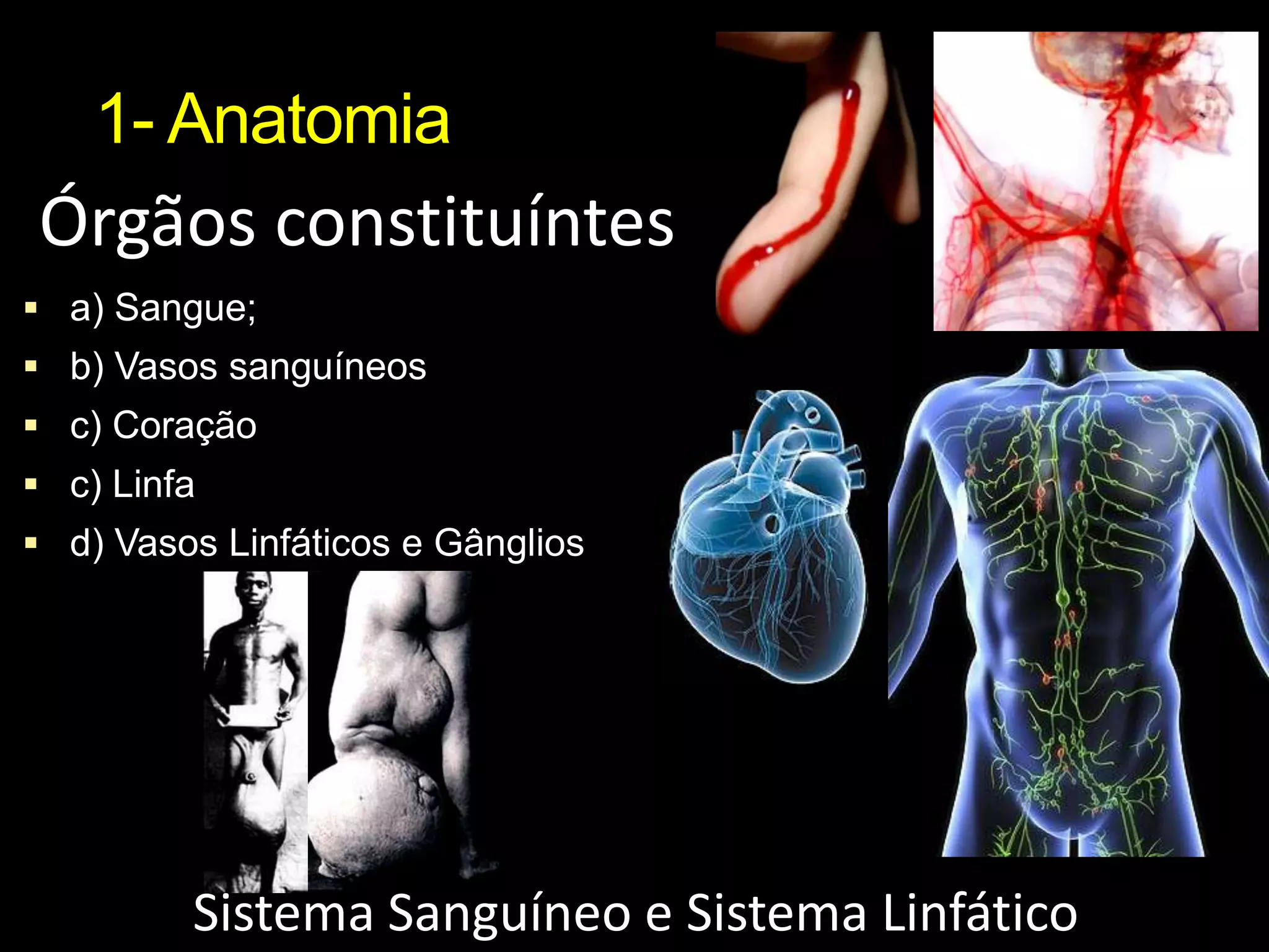 O documento resume os principais conceitos da anatomia e fisiologia do sistema circulatório humano, incluindo a composição do sangue e dos vasos sanguíneos, o papel do coração e a circulação do sangue através do corpo. Ele também descreve brevemente o sistema linfático, formado por órgãos, nódulos linfáticos e vasos que transportam a linfa.