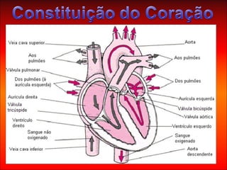 O documento descreve as funções do sangue e seus componentes, incluindo os glóbulos vermelhos, glóbulos brancos, plaquetas e plasma. Também explica os tipos de leucócitos e seus papéis na defesa do corpo, além de descrever as veias, artérias e capilares que compõem o sistema circulatório.