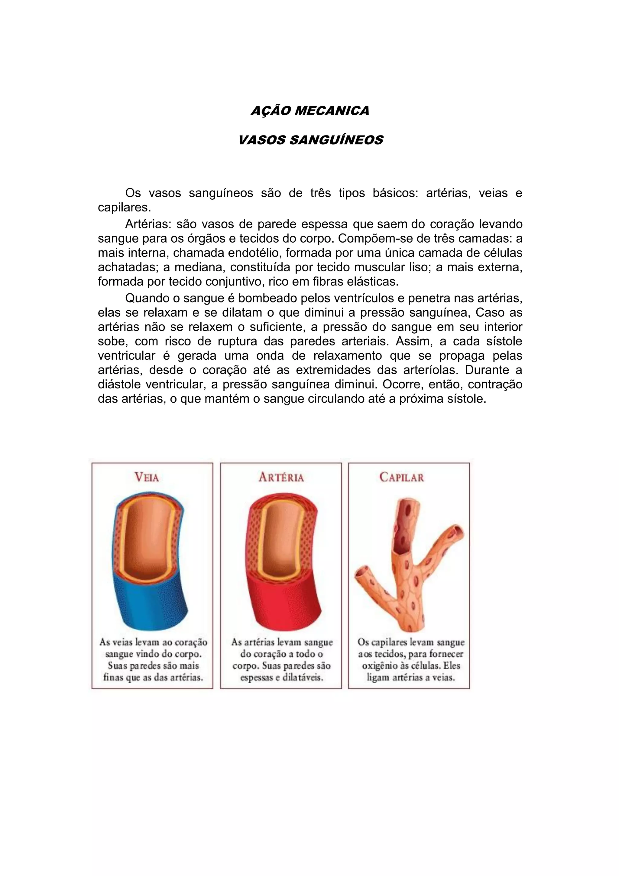 O documento descreve os três tipos básicos de vasos sanguíneos: artérias, veias e capilares. Explica que as artérias transportam sangue oxigenado do coração para os órgãos, possuindo paredes espessas com três camadas. Também descreve como as artérias se contraem e relaxam para regular a pressão sanguínea durante o batimento cardíaco.