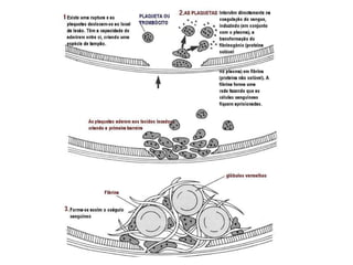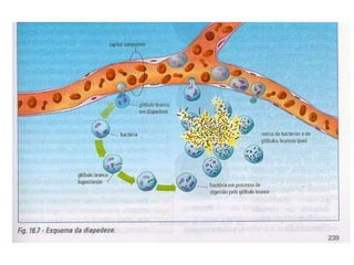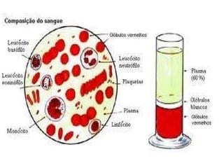 3) O sangue contém plasma, hemácias, plaquetas e leucócitos, que desempenham funções como transporte de gases e combate a infecções.