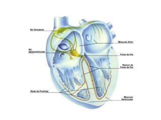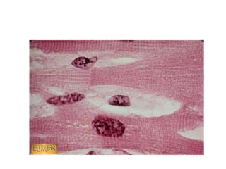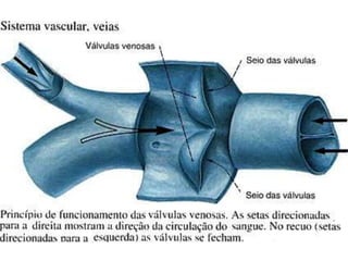 O documento descreve o sistema circulatório, com ênfase no funcionamento do coração e vasos sanguíneos. O coração possui duas bombas que formam dois circuitos circulatórios. Os vasos sanguíneos incluem artérias, veias e capilares, cada um com características estruturais específicas. O documento também aborda a estrutura histológica do músculo cardíaco e dos diferentes tipos de vasos.
