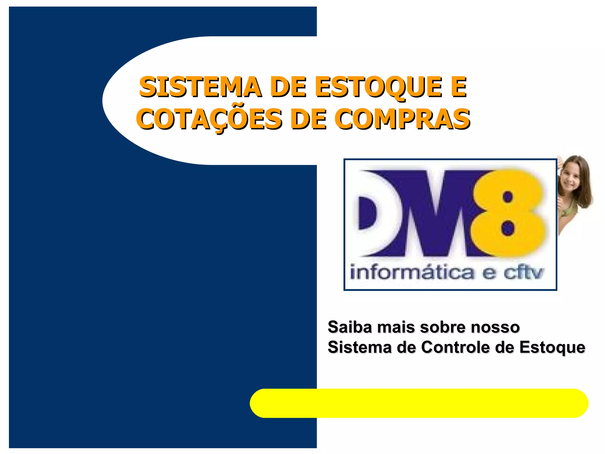 O documento apresenta um sistema de controle de estoque e cotações de compras, que exige que usuários completem seus cadastros após o primeiro login. O sistema permite a gestão de materiais, requisições e cotações, com diferentes interfaces para usuários e administradores. Informações técnicas incluem a plataforma web, sistema de segurança e custos associados ao serviço.