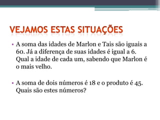 O documento apresenta exemplos de sistemas de equações do 1o e 2o grau. No primeiro exemplo, é resolvido um sistema linear com duas equações e duas incógnitas para encontrar as idades de Marlon e Maria. O segundo exemplo resolve um sistema não linear com duas equações do 2o grau para encontrar dois números cuja soma é 18 e produto é 45.