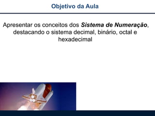 Objetivo da Aula Apresentaros conceitos dos Sistema de Numeração, destacando o sistema decimal, binário, octal e hexadecimal