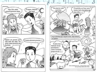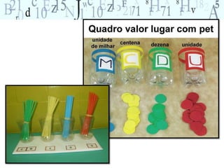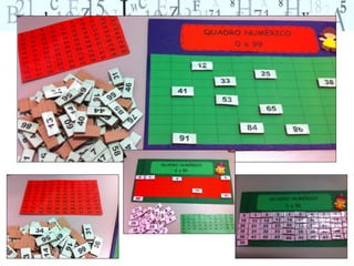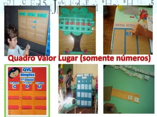 O documento apresenta uma série de jogos e atividades educativas para o ensino de matemática, focando em conceitos de números, unidades, dezenas e centenas. Diversas dinâmicas, como o uso de jogos com dados e fichas, são propostas para engajar as crianças no aprendizado e na construção de habilidades matemáticas. Recursos online também são sugeridos para complementar as atividades práticas.