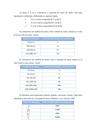 O documento descreve o sistema numérico romano, incluindo os símbolos utilizados (I, V, X, L, C, D e M) e como eles são combinados para representar números maiores através da adição e subtração dos valores. Explica que os símbolos podem ser repetidos até três vezes e que símbolos menores à esquerda subtraem, enquanto à direita somam. Fornece exemplos para ilustrar como números romanos representam valores indo-arábes.