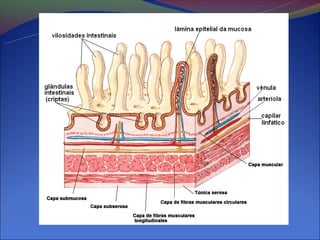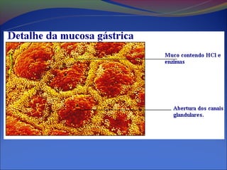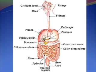 O documento descreve as etapas do processo digestório, incluindo a digestão mecânica e química realizada nos órgãos do trato gastrointestinal. A digestão envolve a ação de enzimas secretadas na boca, estômago, pâncreas e intestino delgado que quebram os alimentos em moléculas menores, permitindo sua absorção.