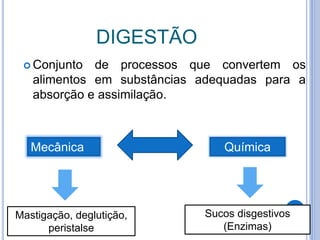 O documento descreve o processo digestivo no corpo humano, incluindo as etapas da digestão mecânica e química e a ação das enzimas digestivas em cada parte do sistema digestório, como a boca, estômago e intestino.
