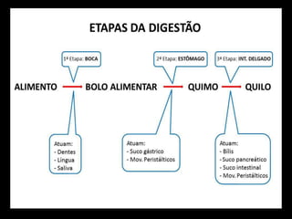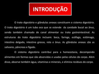 1) O documento apresenta uma introdução sobre o sistema digestório, dividindo-o em trato gastrointestinal e órgãos acessórios.