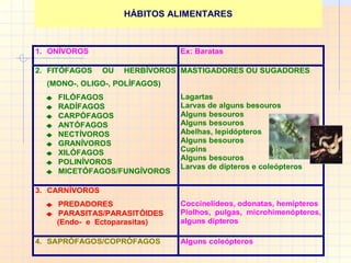 O documento descreve o sistema digestório e excretor de insetos. O sistema digestório é dividido em três regiões - intestino anterior, médio e posterior - cada um com funções específicas como digestão, absorção e excreção. Os túbulos de Malpighi filtram as excretas nitrogenadas e formam ácido úrico, que é excretado.