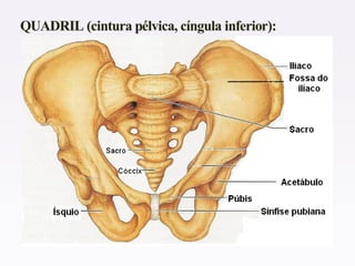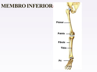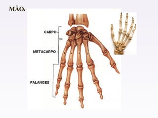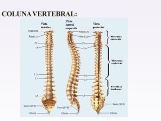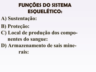 O documento descreve as funções do sistema esquelético humano, incluindo sustentação, proteção e produção de células sanguíneas. Ele também lista e exemplifica os quatro tipos de ossos - longos, curtos, planos e irregulares. Além disso, caracteriza as partes de um osso longo e discute doenças como osteoporose e raquitismo.