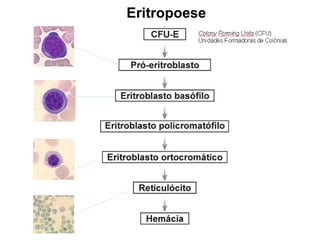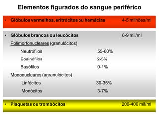 O documento discute os processos de hematopoese e formação dos elementos figurados do sangue. Apresenta os principais locais onde ocorre a hematopoese ao longo do desenvolvimento, como a medula óssea no período pós-natal. Descreve os processos de eritropoese, trombocitopoese e leucopoese, incluindo os estágios de desenvolvimento dos eritrócitos, plaquetas, granulócitos, monócitos e linfócitos.
