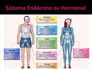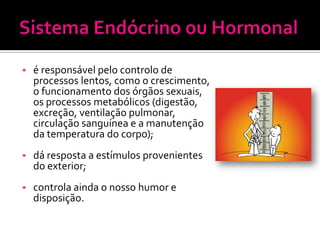 O documento descreve o sistema endócrino e hormonal no corpo humano. O sistema endócrino é responsável pelo controlo de processos lentos através da produção e secreção de hormonas nas glândulas endócrinas. As hormonas atuam como mensageiros químicos no sangue para influenciar a atividade de outros órgãos e tecidos.