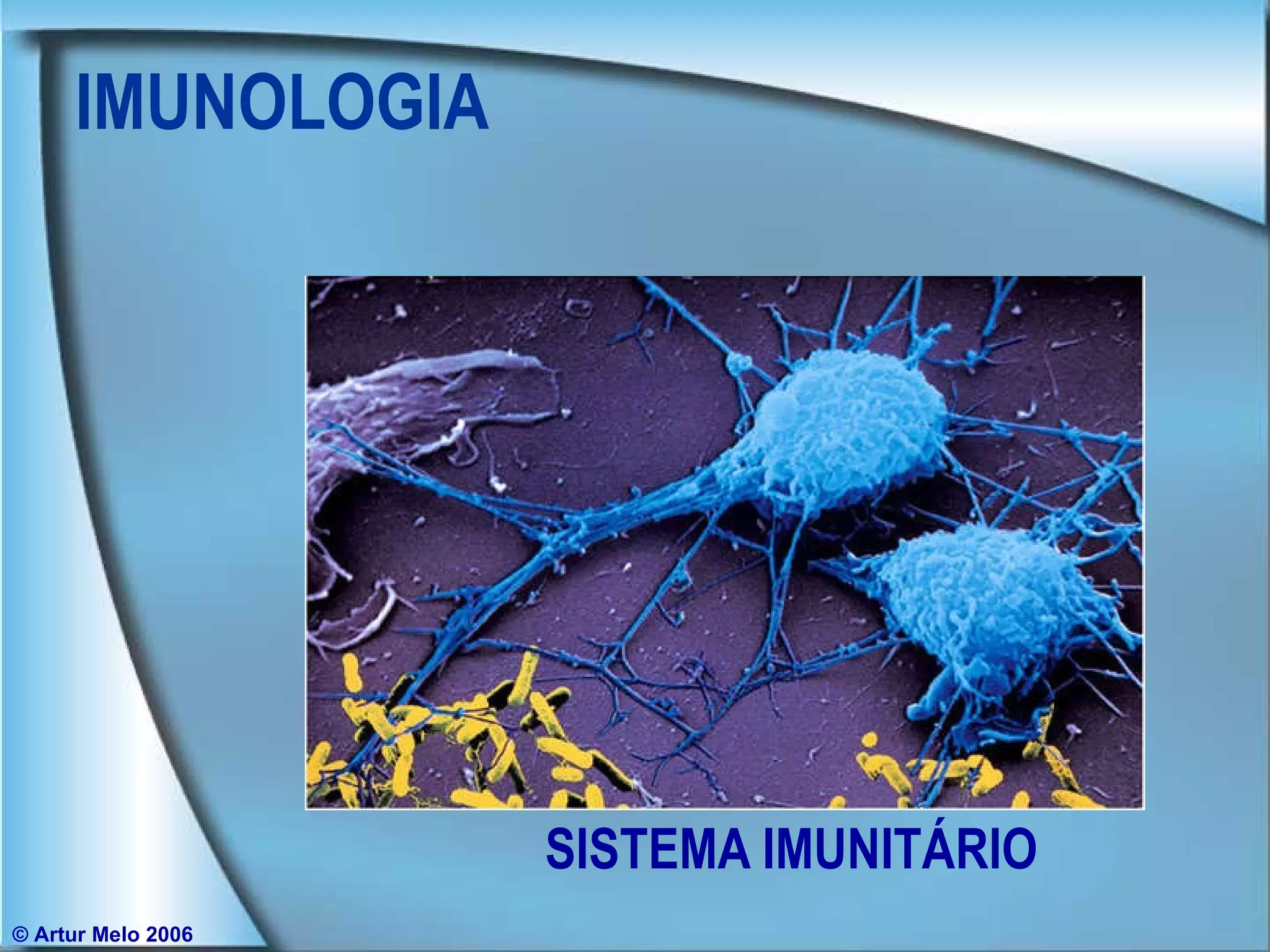 O documento descreve o sistema imunitário e seus componentes principais, incluindo organismos patogênicos como vírus e bactérias. Detalha as características e replicação de vírus, doenças virais humanas importantes e como os vírus causam doenças. Também descreve as características gerais de bactérias, sua diversidade, mecanismos de reprodução e doenças bacterianas humanas importantes.